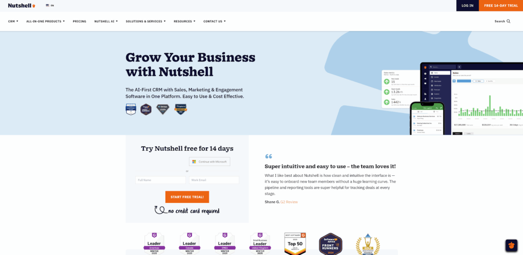 Nutshell is an AI-first CRM platform that combines sales, marketing, and engagement tools in one solution. This makes Nutshell ideal for small, mid-sized, and enterprise businesses that want a single, easy-to-use system rather than stitching together separate sales, email marketing, and communication tools.