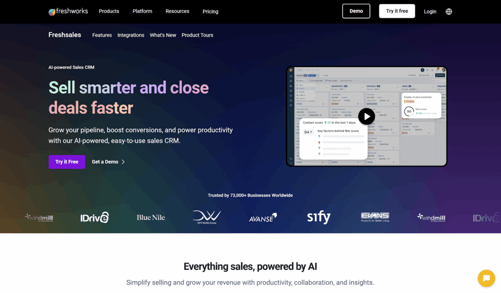 Freshsales, part of the Freshworks product family, is a CRM that emphasizes ease of use. It brings along “Freddy AI,” a suite of AI features that include a chatbot, AI-driven deal insights, and automated email drafting.